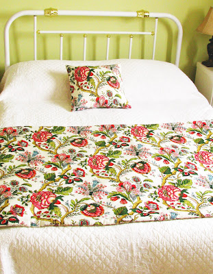 Il me fallait être un peu plus créative... Et c'est alors que j'ai pensé à plutôt utiliser un couvre-lit blanc et à fabriquer moi-même un jeté aux motifs floraux pour ajouter la touche de motifs dont j'avais envie. Je me suis mise en quête du tissu idéal, mais encore là, les tissus que je trouvais en boutique n'avaient jamais le petit côté ancien et romantique que je voyais chez Pottery Barn. Je me suis donc tournée vers les tissus "vintage", et j'ai finalement trouvé la perle rare sur Etsy.